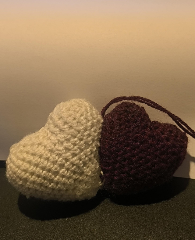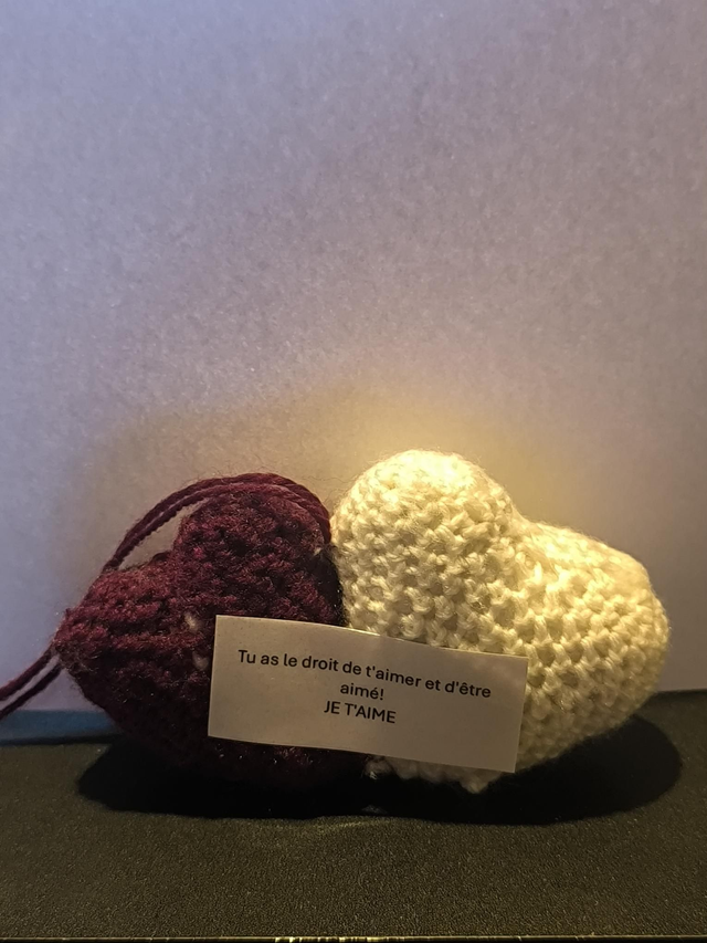 Double coeur fait main au crochet avec sa carte positive.