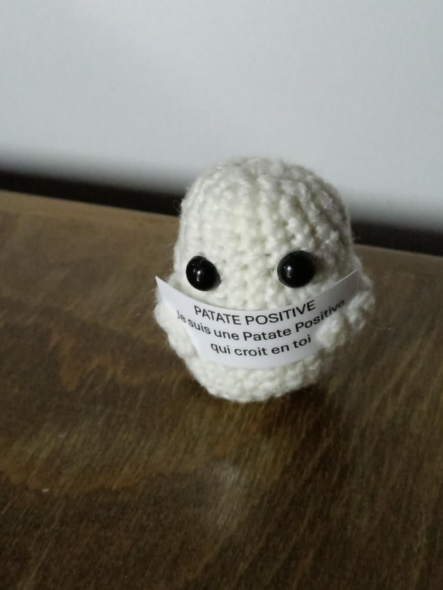 Cette belle patate positive fait au crochet avec sa petit carte positive